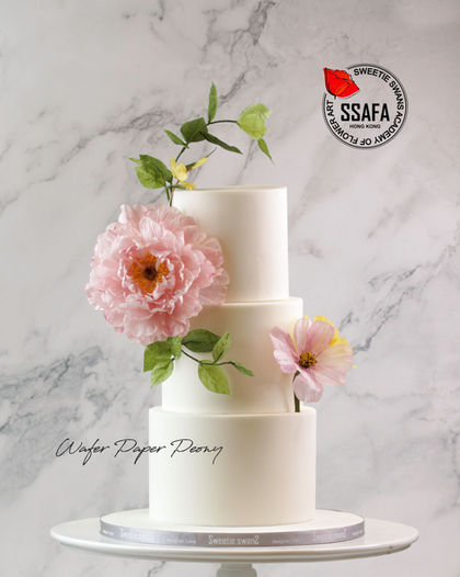 3-tier ivory cake decorated with handmade wafer paper peony & cosmos