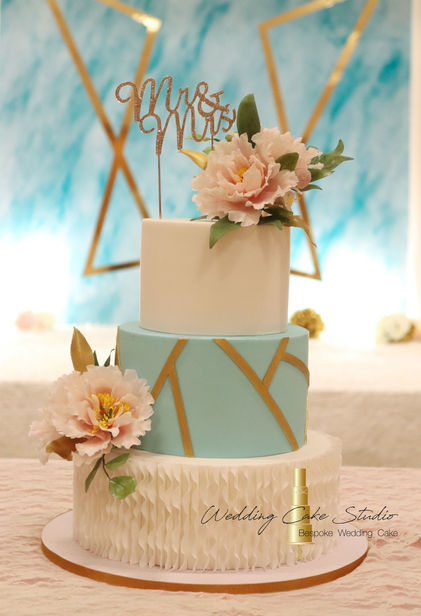 3-tier wedding cake decorated with handmade wafer paper peonies, fondant frill design at bottom tier & gold bracing ornament